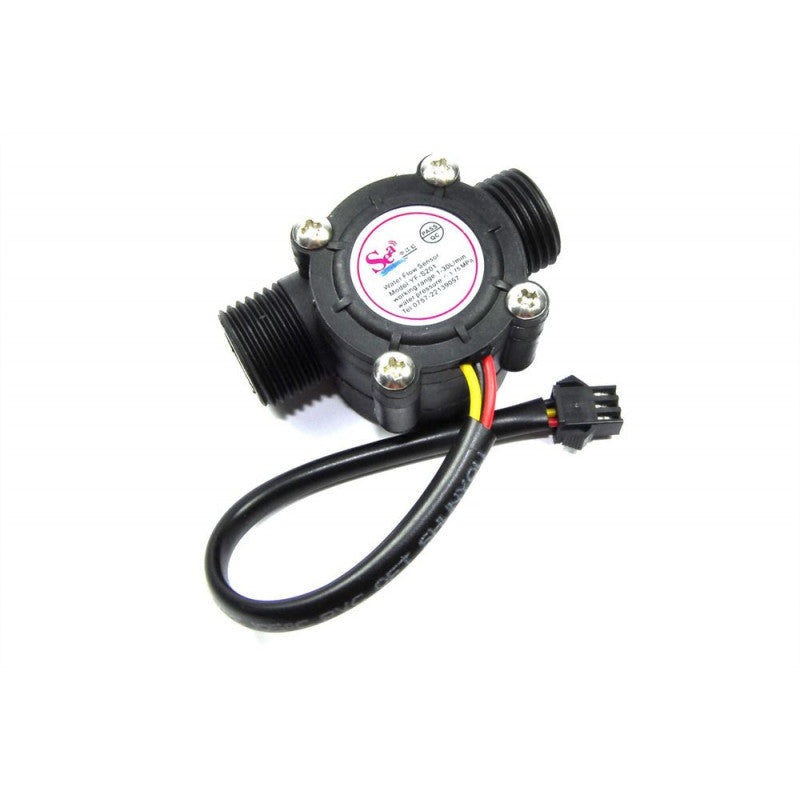 The YF-S201 1/2 inch water flow sensor is designed to be installed inline with the water pipe and features a pinwheel sensor that tracks the amount of water flowing through it. It includes an integrated magnetic Hall-effect sensor that generates an electrical pulse with each revolution. The YF-S201 sensor has just three wires, making it easy to connect to any microcontroller or Arduino board. It operates on +5V Vcc and provides pulse output, requiring a secure fit within the water pipeline.