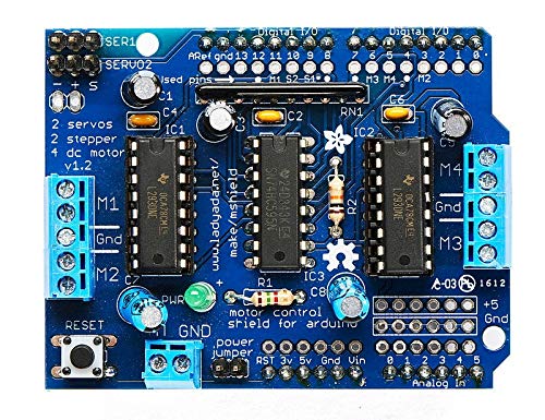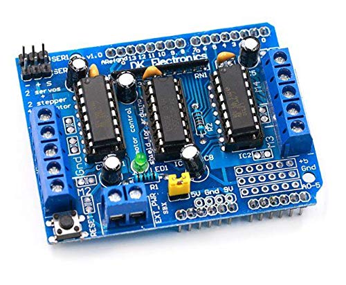 This L293D Motor Driver Shield for Arduino is probably one of the most versatile on the market and features 2 servo and 4 motor connectors for DC or stepper motors. That makes it a great shield for any robotic project.