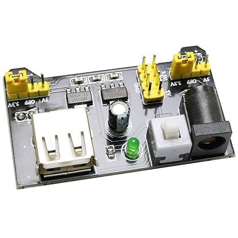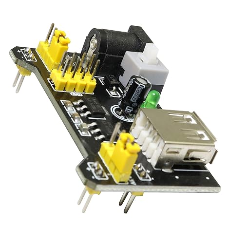 This is a 3.3V/5V MB102 Breadboard Power Supply Module which provides a dual 5 V and 3.3 V power rails and has a multi-purpose female USB socket. The 3.3V/5V MB102 Breadboard Power Supply Module securely fits in a standard 400 tie point breadboard or GL12 840 Points breadboard.