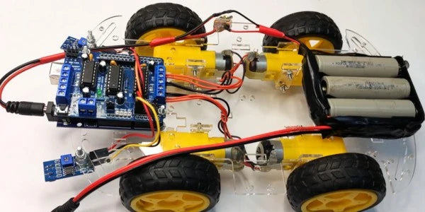 Using IR reflective sensors (TCRT5000) and an L293D Motor Driver Shield, the robot can detect black/white track lines and automatically follow the path with precision.