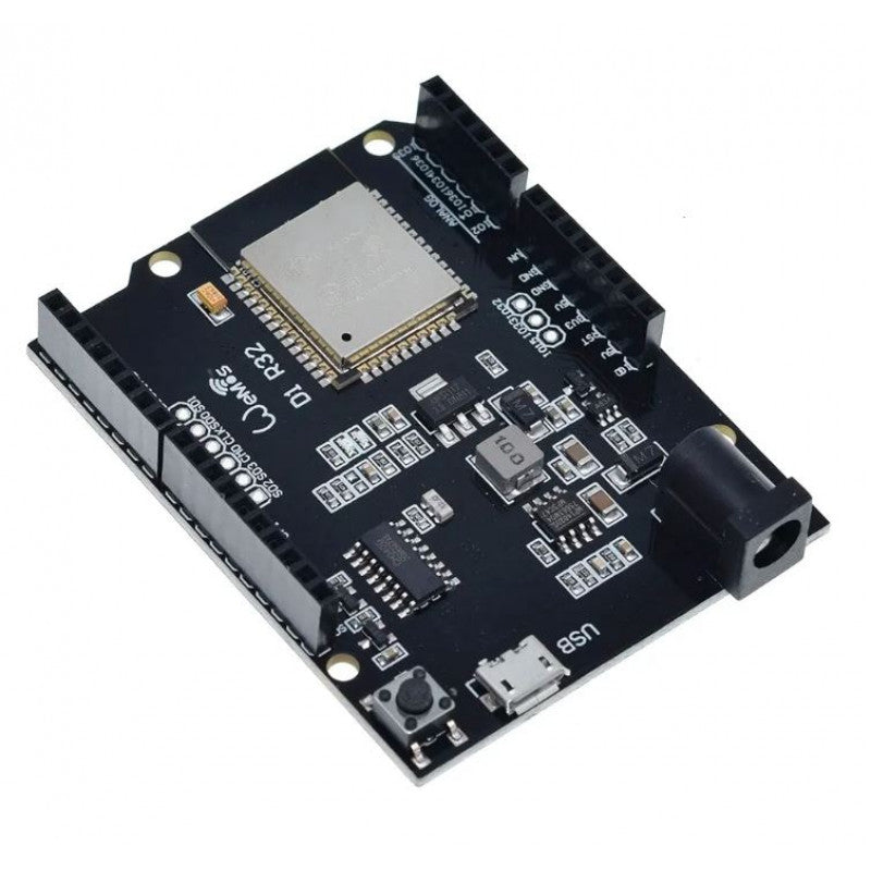 This board is equipped with an ESP-WROOM-32 module and features the standard UNO size and connectors. The ESP32 WiFi Bluetooth UNO D1 R32 Development Board includes 4MB of flash memory and a Micro USB port. The ESP-WROOM-32 (ESP-32S) is a WiFi and Bluetooth module powered by the ESP32 chip from ESPRESSIF. The ESP32 chip comes with a dual-core processor, 448 KBytes of ROM, 520 KBytes of SRAM, 16 KBytes of SRAM in RTC, supports 802.11 b/g/n/e/I Wi-Fi, Bluetooth v4.2 BR/EDR & BLE, and includes clocks, timers, various peripheral interfaces, and security features. It is compatible with multiple platforms, including Arduino, for software development.